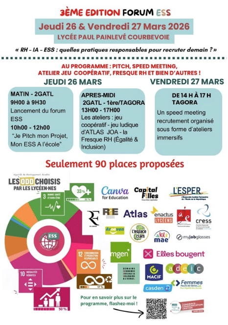 Durant la Semaine de l’Economie Solidaire et Sociale à l’Ecole, le lycée Paul Painlevé organise la 3ème édition du Forum ESS autour de 4 thèmes et 4 ateliers ludiques, les 26 et 27 mars 2026, placé cette année sous le thème :« RH – IA – ESS : quelles pratiques responsables pour recruter demain ? ».