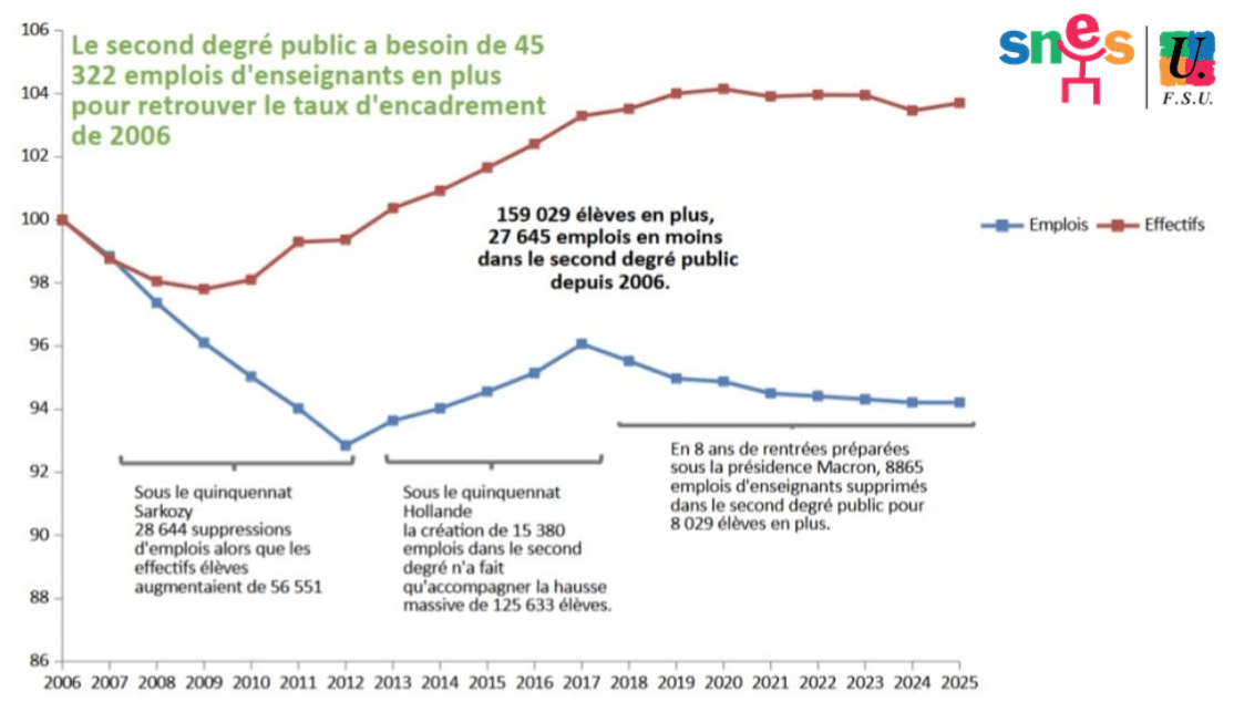 SNES FSU contre argumente avec des données chiffrées sur les 20 dernières années : « sur les 8 précédentes rentrées préparées sous Emmanuel Macron, 8 865 emplois d’enseignant·es ont été supprimés dans le second degré public alors même que 8 029 élèves supplémentaires étaient accueillis dans les collèges […] le second degré public a été la grande victime, en termes d’emplois et de réformes, des politiques publiques depuis 2006. Ses effectifs élèves ont augmenté de 4 % pendant que les emplois baissaient de 6 % »