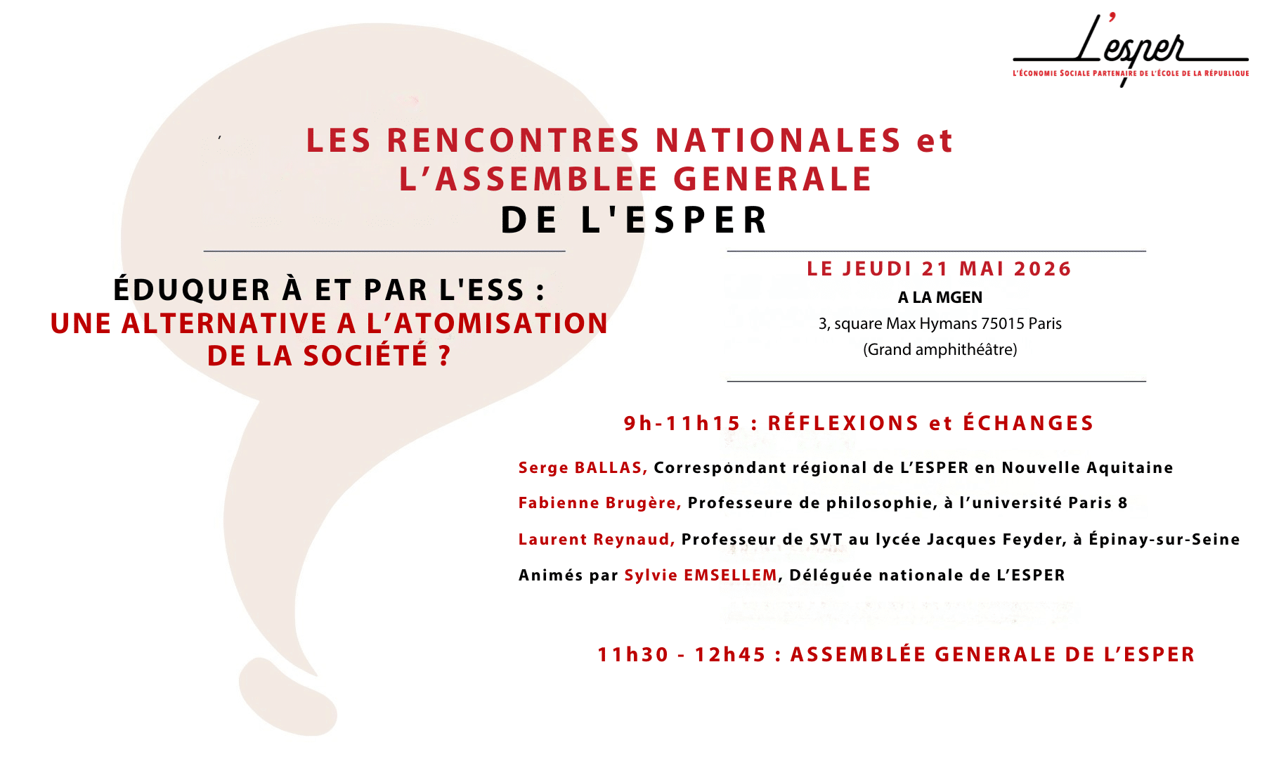 L’ESPER a le plaisir de vous convier aux rencontres nationales, le jeudi 21 mai 2026, à la MGEN (grand amphithéâtre au 3 square Max Hymans, 75015 Paris) dès 9h et jusqu’à 11h15.