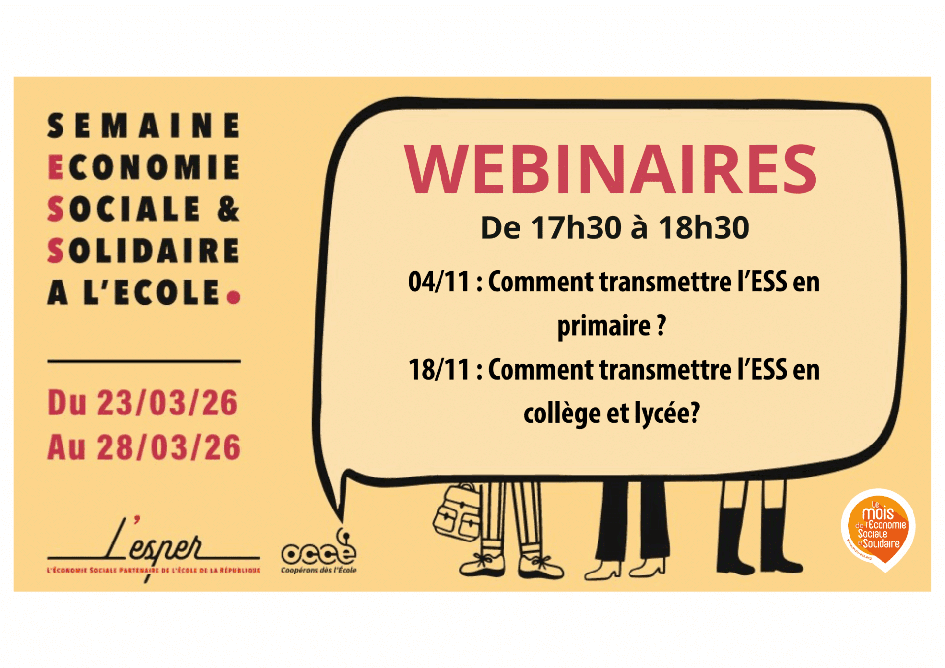 En prévision de la 10ème édition de la Semaine de l’ESS à l’École, qui aura lieu du 23 au 28 mars 2026, L’ESPER et L’OCCE vous invitent à venir réfléchir aux manières de transmettre l’ESS en classe et présenteront des outils pédagogiques adaptés aux niveaux des élèves, à la durée de l’intervention…