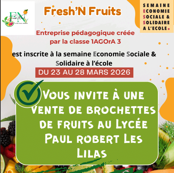 La classe de 1ère professionnelle AGORA3 du Lycée Paul Robert aux Lilas, accompagnée de son enseignante d’économie-gestion, mène un projet d’entreprise pédagogique sociale et solidaire nommée « Fresh’N Fruits». Ce projet consiste à vendre des brochettes de fruits au sein du lycée, à destination des lycéen·nes et des enseignant·es, dans l’objectif de favoriser la consommation de fruits, comme le préconise l’Organisation Mondiale de la Santé. Les fruits proviennent directement d’agriculteurs bio de proximité et sont vendus à prix symboliques.