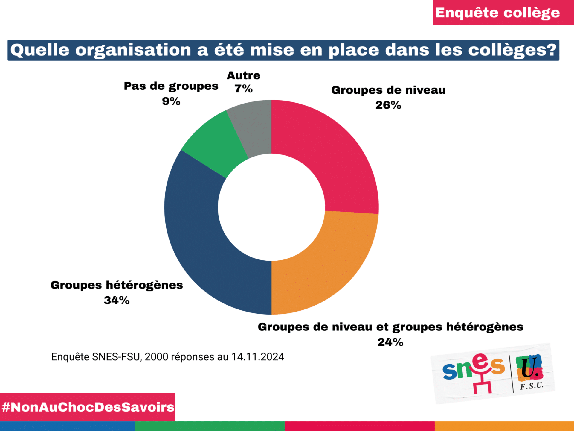 De plus, selon l’enquête réalisée fin 2024 par SNES-FSU, bien qu’obligatoires à la rentrée scolaire 2024-2025 dans tous les collèges pour les classes de 6ème et de 5ème pour les enseignements de français et de mathématiques, seuls 26% des collèges auraient mis en place les « groupes de niveaux » en suivant rigoureusement la réforme (c’est-à-dire en formant des groupes homogènes) cette année-là.