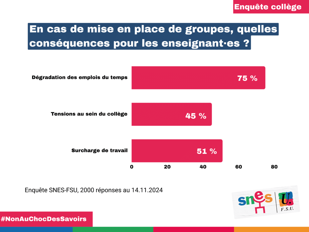 Cette enquête indique également que la mise en place des « groupes de niveaux » a entrainé une forte dégradation des conditions de travail des enseignant-es.