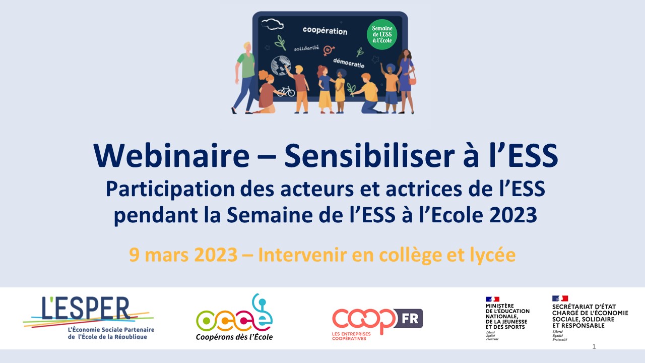 Dans le cadre de la préparation de la Semaine de l’Économie Sociale et Solidaire à l’Ecole, qui aura lieu du 27 mars au 1er avril 2023, L’ESPER, L’OCCE et Coop FR ont proposé un webinaire à destination des acteurs et actrices de l’ESS “Intervenir en collège et lycée”.